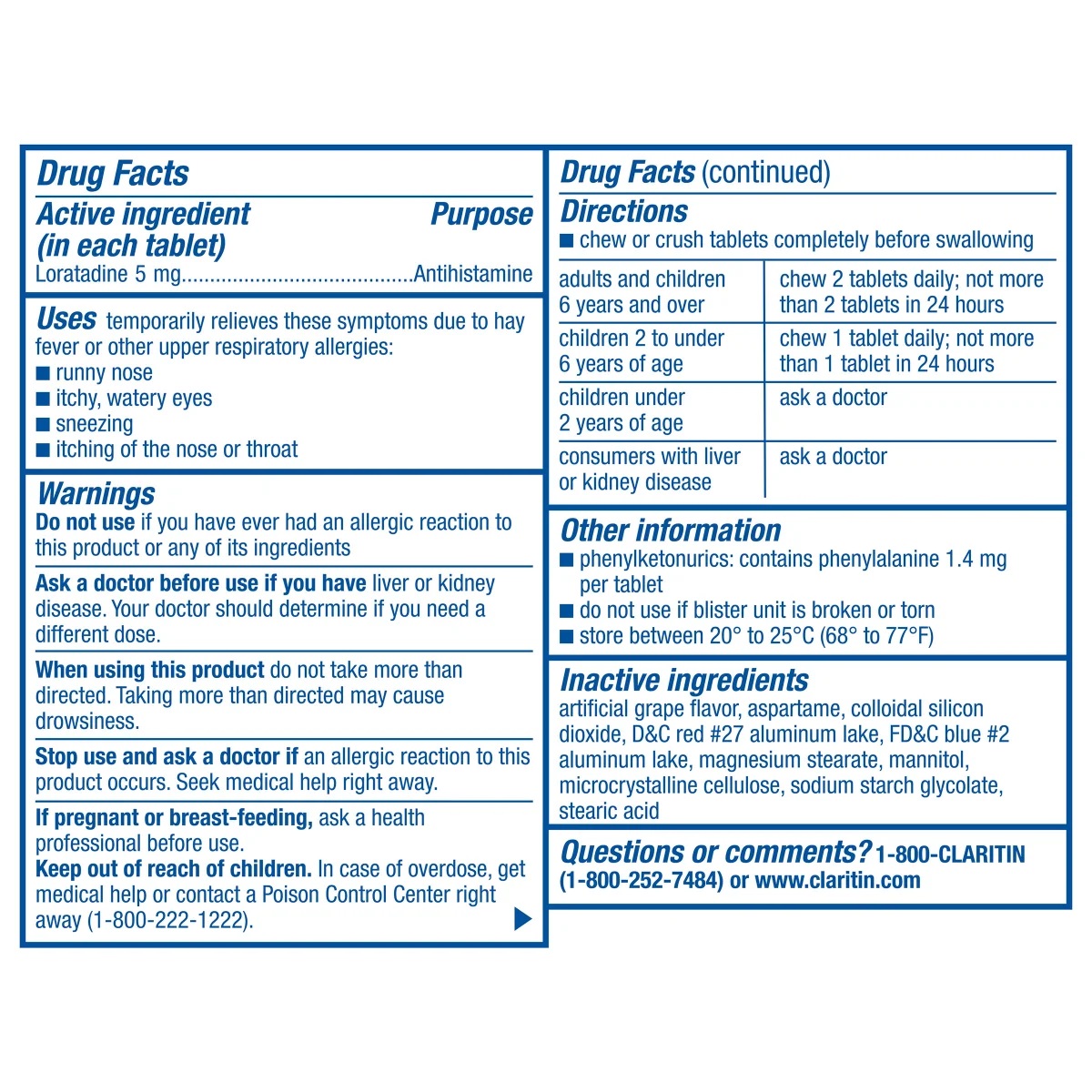 어린이용 클라리틴 24시간 비졸림 알레르기 완화 포도맛 저작정제는 재채기, 콧물, 물 같은 눈, 가려운 코, 목 또는 눈의 증상으로부터 24시간 동안 알레르기 완화를 제공합니다. 어린이용 클라리틴은 실내 및 실외 알레르기를 위해 설계된 항히스타민제로, 2세 이상의 어린이를 위한 제품입니다. 어린이용 클라리틴은 비졸림 효과가 있는 경구 알레르기 치료제 중에서 소아과 의사들이 가장 추천하는 제품입니다.