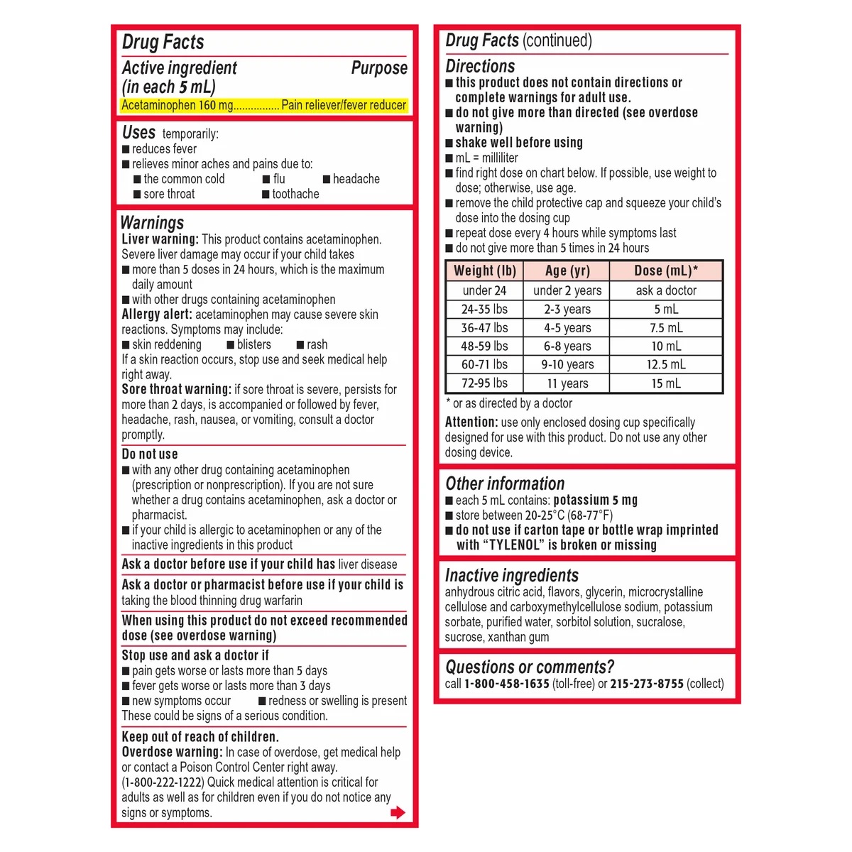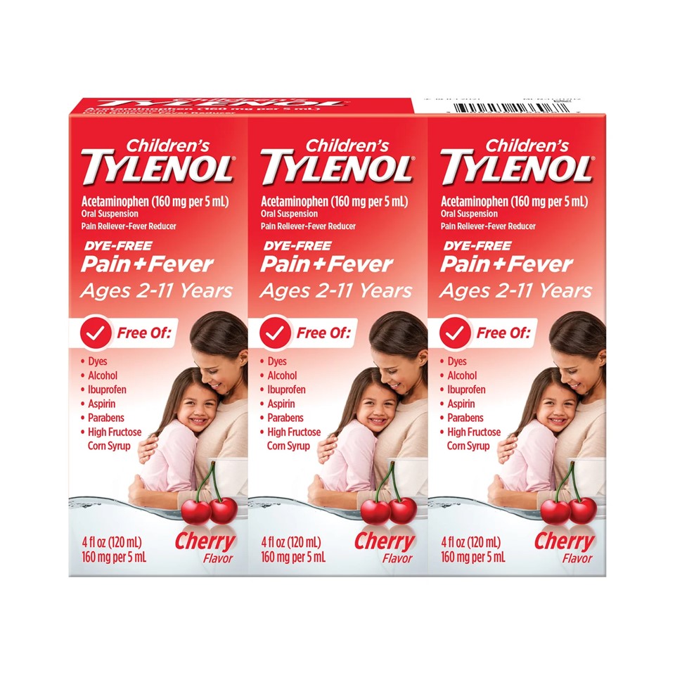 - 무색소 체리 맛의 어린이 타이레놀 액체 구강 현탁액 진통제 + 해열제가 포함된 3개의 4온스 병으로, 인후통, 두통 및 열을 포함한 감기 및 독감 증상을 일시적으로 완화합니다.